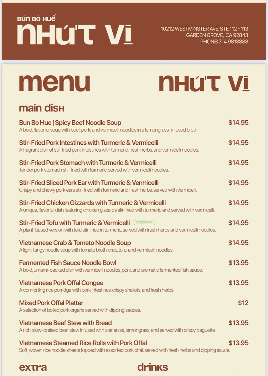 Bún bò huế NHỨT VỊ offers a delightful taste of authentic Vietnamese cuisine, nestled in the heart of Garden Grove, California. A short jaunt to 10212 Westminster Ave brings you to a culinary haven, renowned for its fresh, fragrant dishes that are steeped in tradition and flavor.